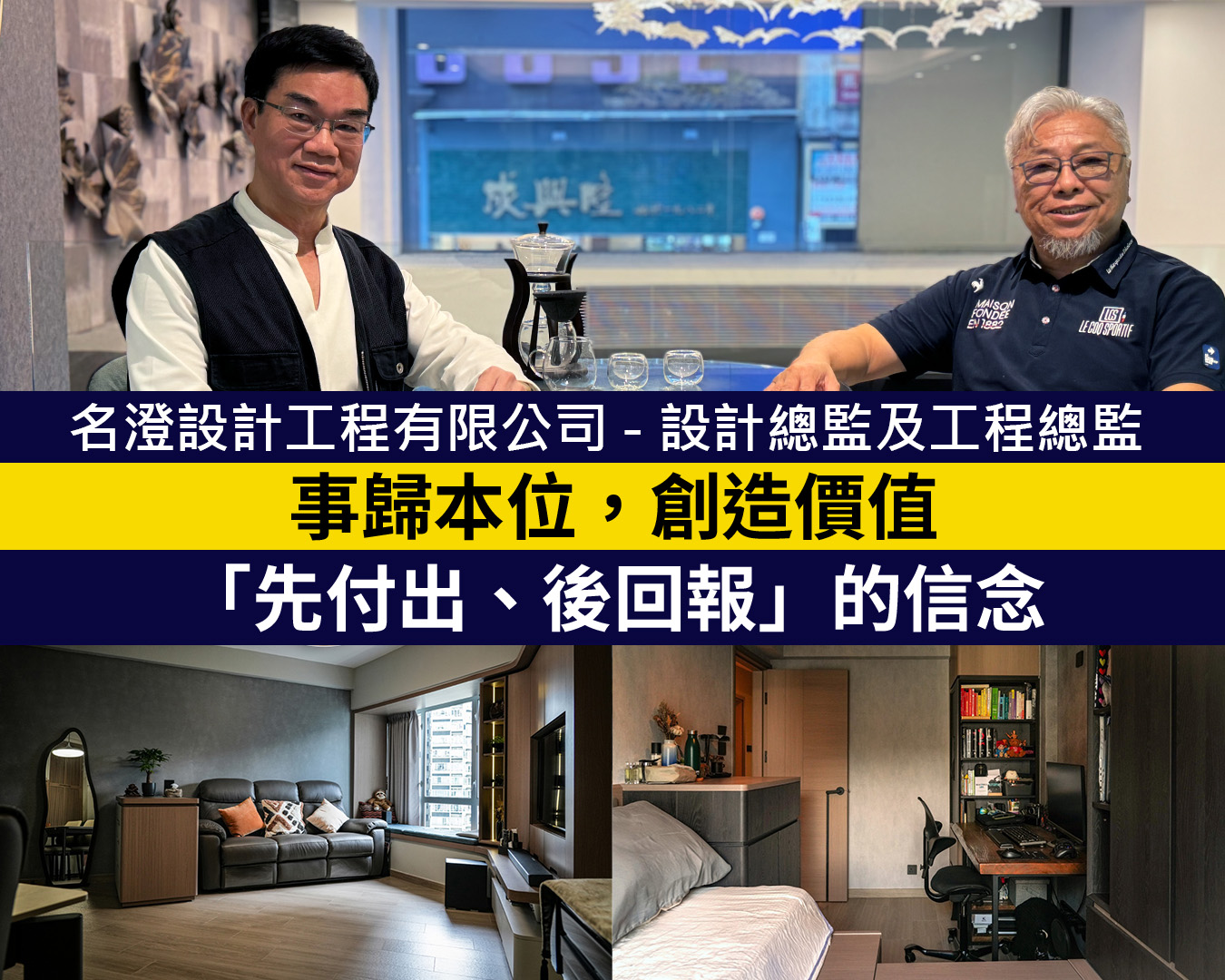 名澄設計工程有限公司在競爭激烈的市場中穩步發展,建立起值得信賴的品牌形象。公司由設計總監盧耀邦(James)與工程總監傅忠源(Andy)主理,他們認為裝修不僅是工程,更是實現客戶理想生活的過程。James 強調,公司的核心在於解決客戶裝修中的難題,並融入時尚設計、獨特風格與舒適空間規劃,打造符合客戶期待及理想中的家。