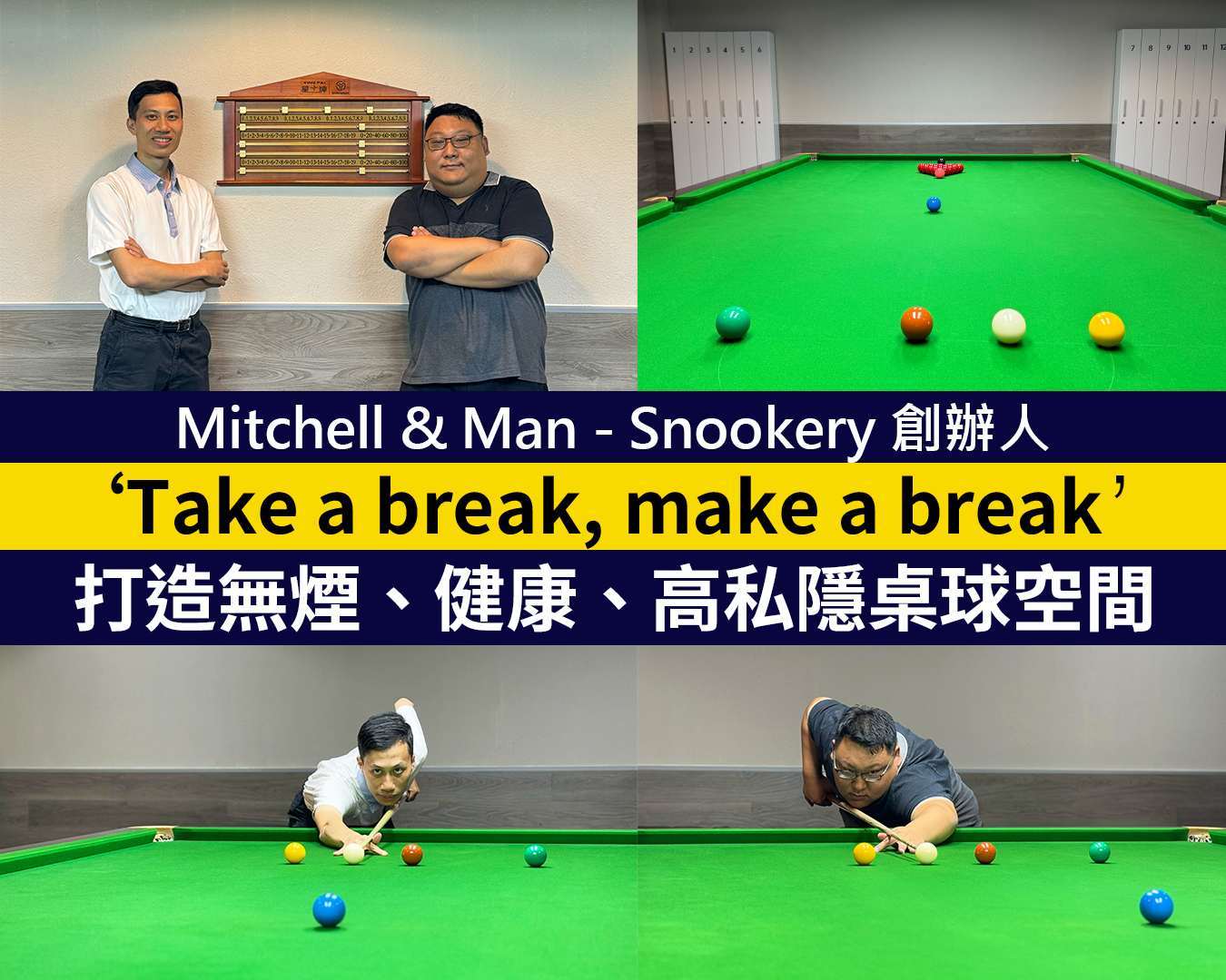 Mitchell Fok 和 Man Cheung 是Snookery的創辦人。現時,他們擁有三間分店,Mitchell主要負責公司的軟件、網頁維護及課程跟進等工作;Man則負責客戶租場的聯絡工作。他倆自小就很喜愛玩桌球,一直很嚮往擁有一個乾淨和寧靜的場地進行這活動,所以他們踏入社會工作後便合資租用一個地方打桌球。起初,他們只是為了有一個地方讓自己在工餘後放鬆、聚腳和發展桌球的興趣,並沒有打算當作一門生意。後來,在朋友的介紹下,愈來愈多人有興趣到他們的地方打桌球,於是他們便開始租借場地這門生意。